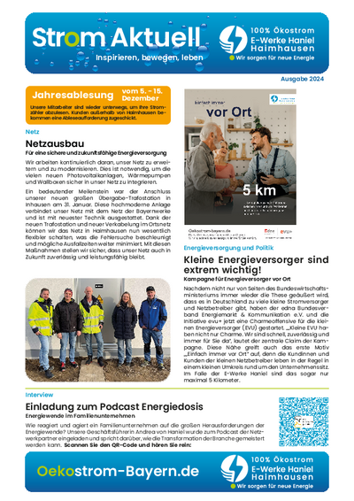 auch dieses Jahr möchten wir Sie mit unserem Jahreskundenbrief STROM AKTUELL 2024 über wichtige Themen informieren. Wir wünschen Ihnen viel Spaß beim Lesen.